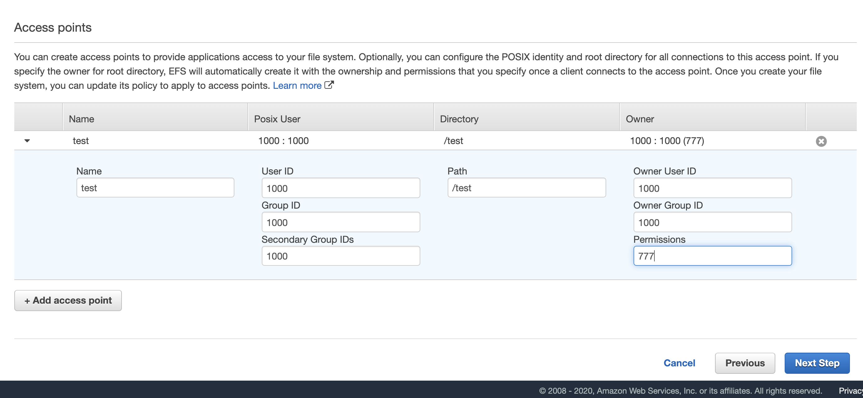 저는 위와 같이 했습니다. 여기서 주의할 점은 Directory에 경로를 단지 '/' (root 디렉토리)로 하면, 접근할 때 permission denied라는 메세지와 함께 접근할 수 없다. 이것을 몰랐던 저는 다른 부분 (보안 그룹, iam 설정 등등..) 에만 신경쓰며 엄청난 시간을 소요했었습니다.