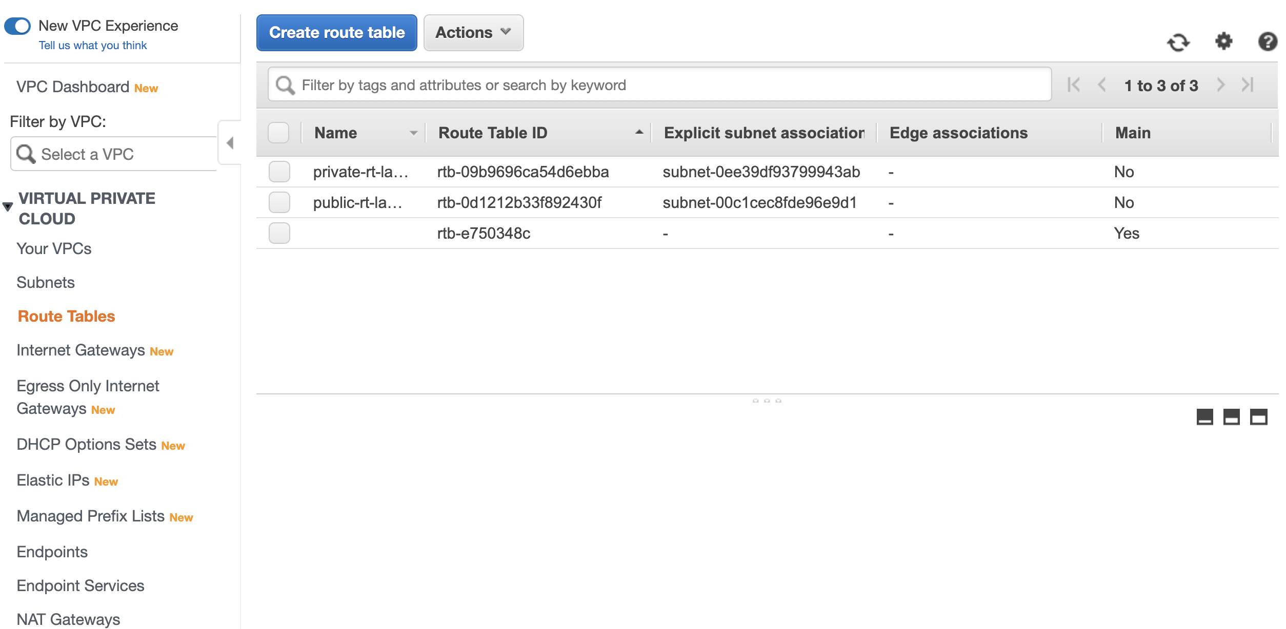 각각 private, public Subnet과 연결할 Route Table을 생성합니다.