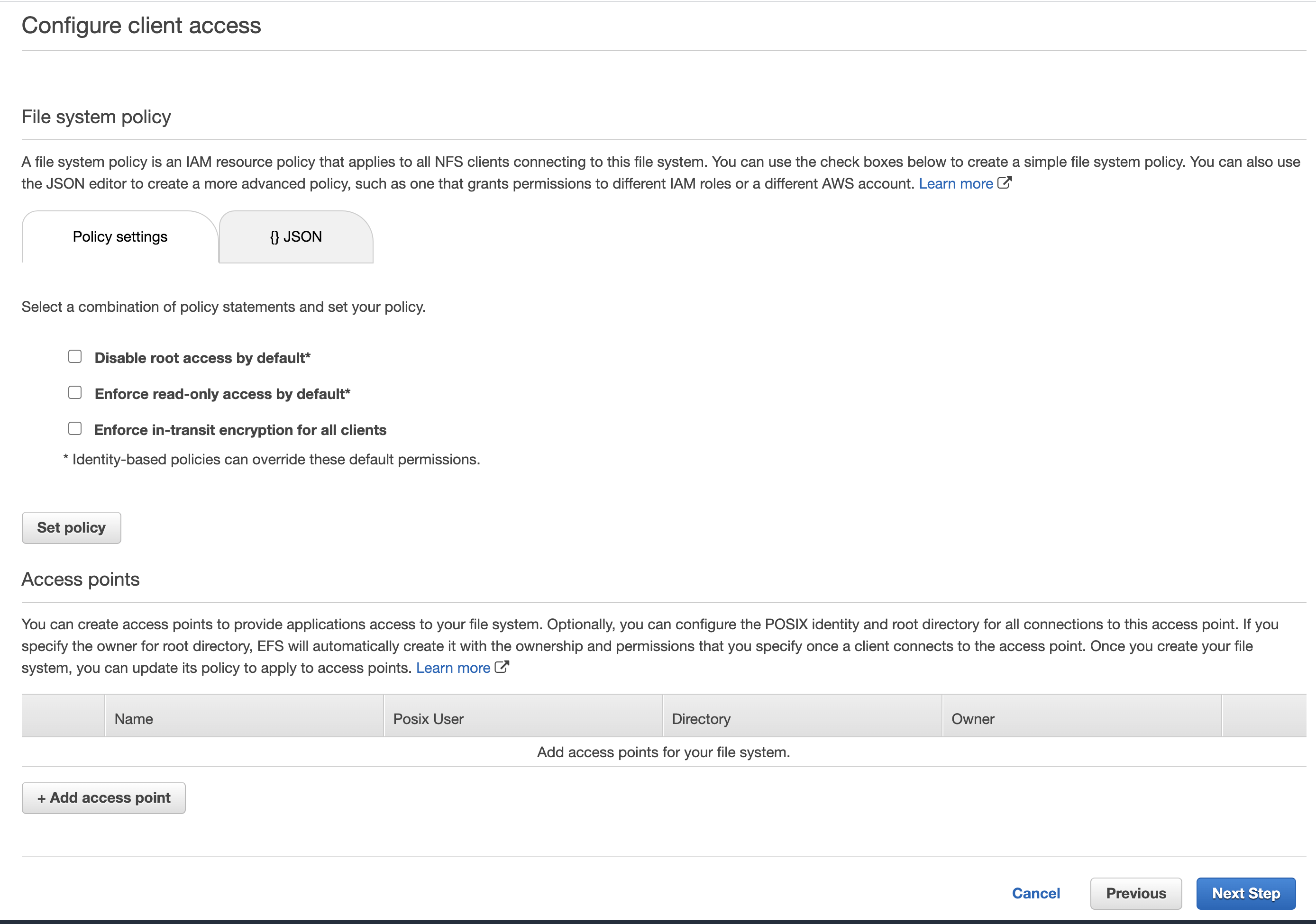 보안적으로 빡빡하게 할 것이 아니라면, 체크박스를 모두 건너뛰고 Set policy를 합니다.