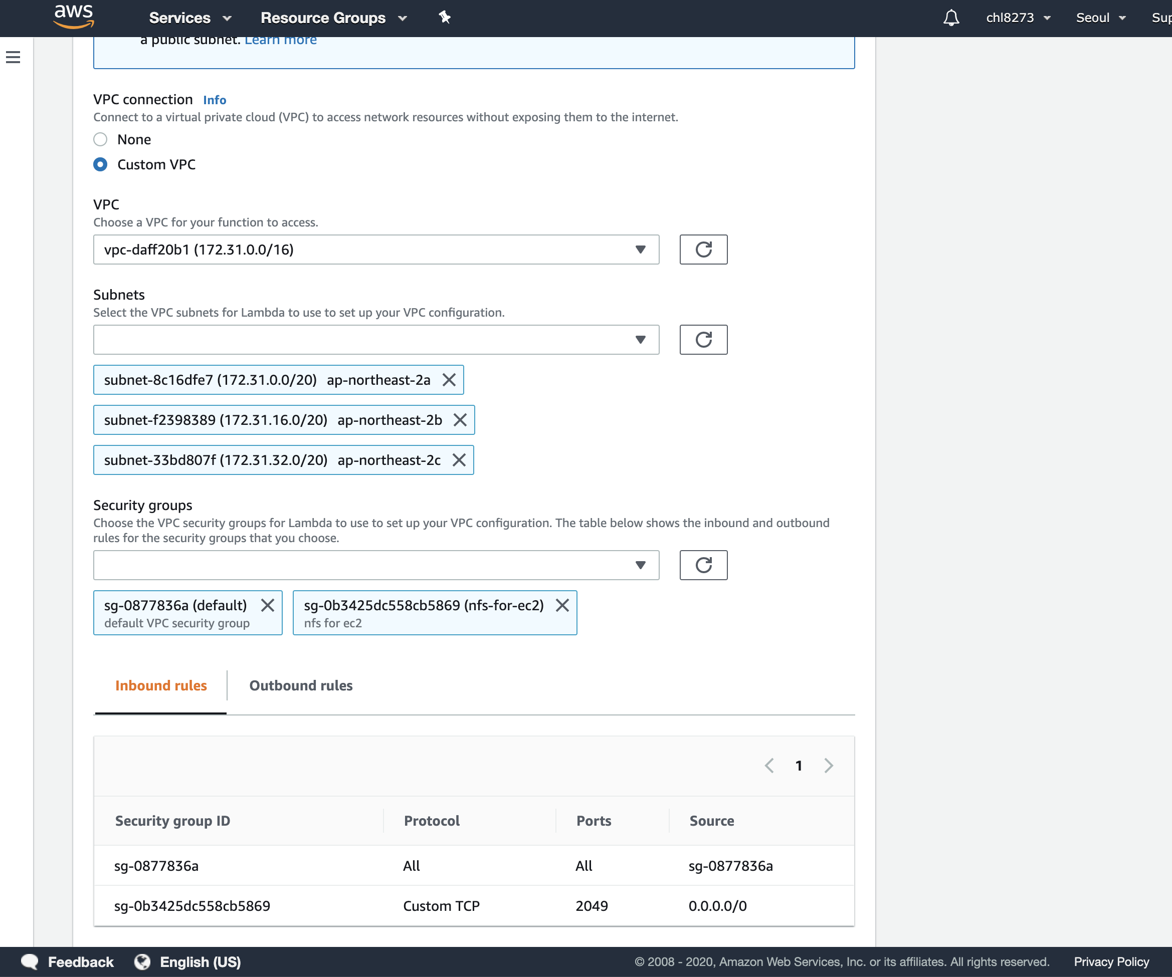 이번 실험에서는 efs를 위해 lambda가 efs와 같은 vpc에 있어야 하여 특정 vpc에 포함되어 있는 상태 입니다.