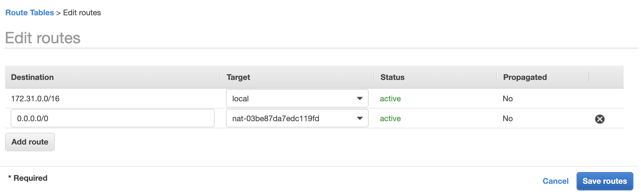 동일한 방법으로 private Subnet 또한 Edit routes를 합니다. private Subnet에는 앞서 만들었던 NAT Gateway를 Target으로 설정합니다.