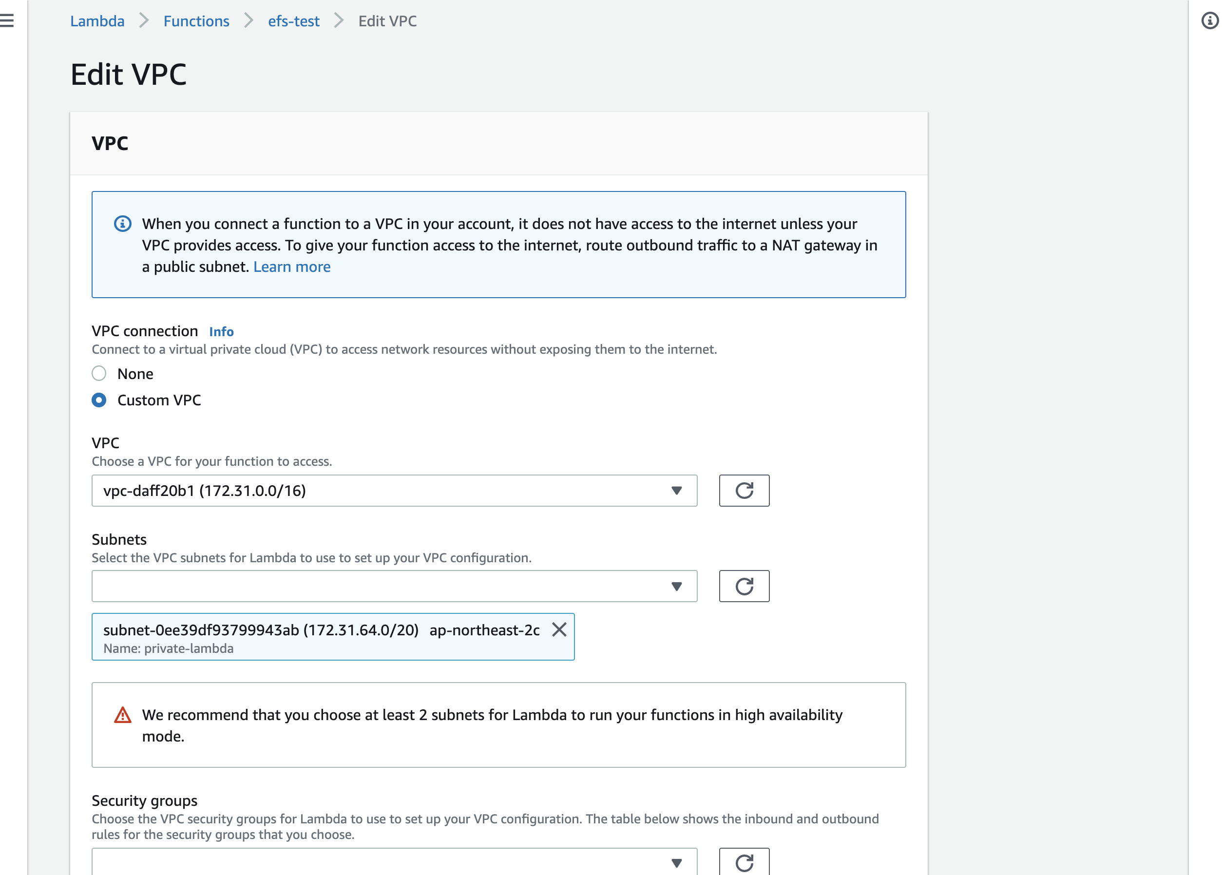 lambda가 특정 vpc에 포함되지 않고 전역으로 존재할 때에는 설정할 필요가 없습니다.