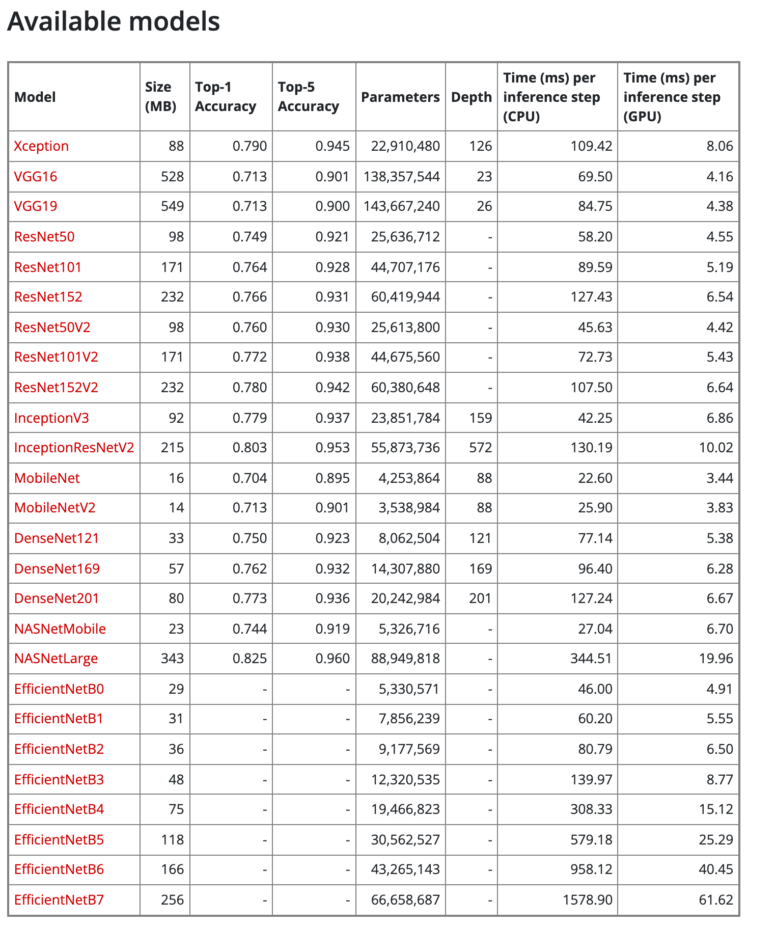 keras에는 위와 같이 MobileNet처럼 Parameters수가 작은 모델 부터 VGG16같은 Heavy한 모델도 지원해주고 있다.