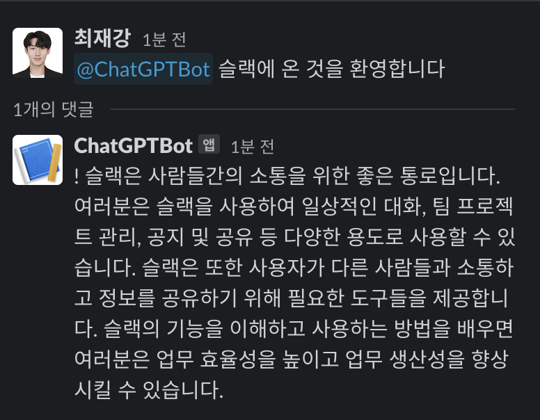 Python 코드로 Slack에 ChatGPT를 연동하면서 제가 미쳐 대응하지 못한 버그가 발생하거나 비효율적으로 동작할 수 있는 부분이 있을 수 있습니다.