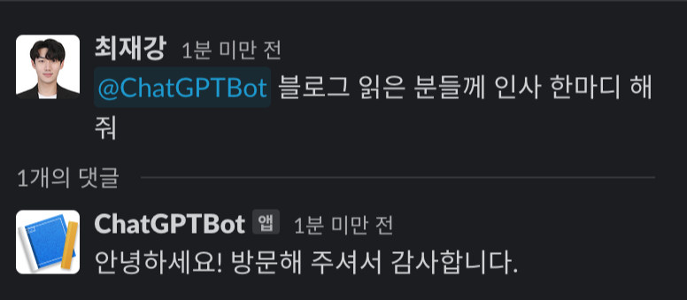 Slack RTM 클라이언트를 통해 슬랙 채널에서 @ChatGPTBot을 언급하면 정의해둔 chatgptbot 함수가 실행되는 방식이다.