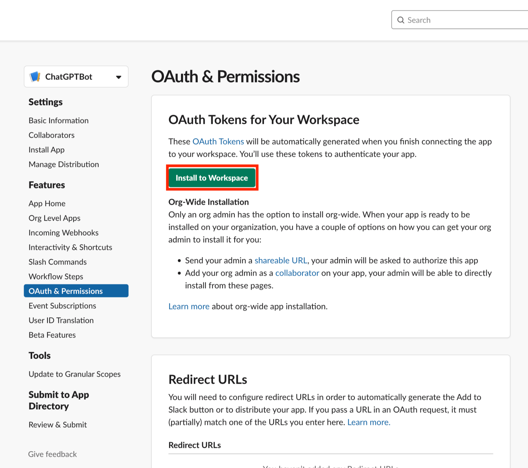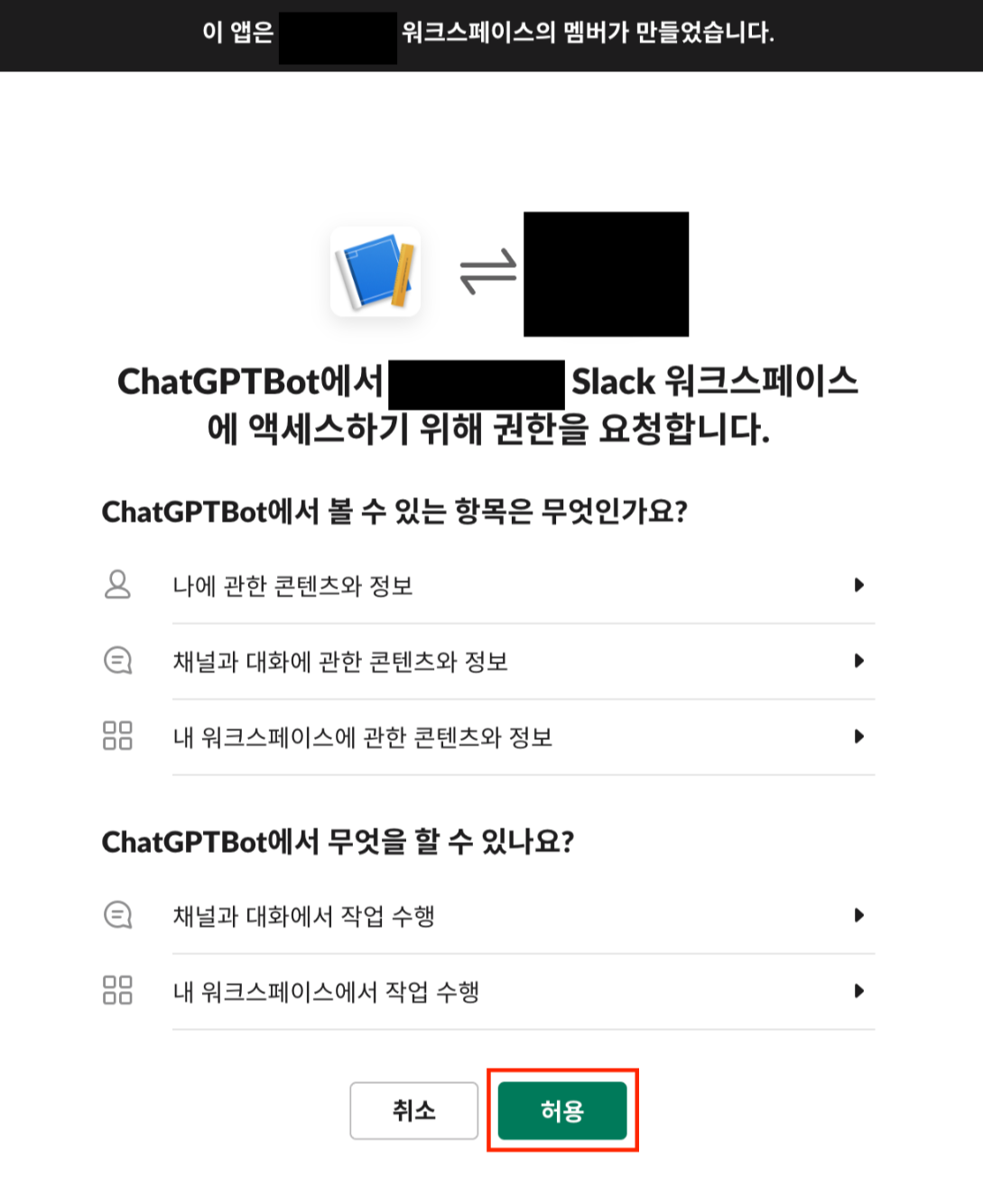 OAuth Scopes 추가를 완료했다면, 다시 페이지 위로 올라가 Install to Workspace 버튼을 클릭한다.