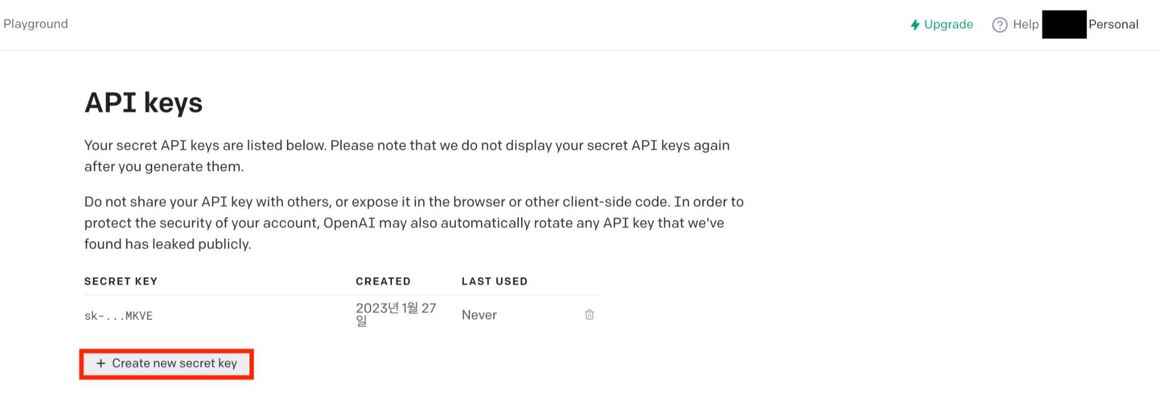 해당 페이지에서 Create new secret key 버튼을 클릭한다.