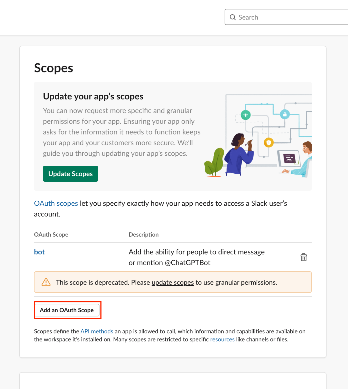 OAuth Scopes란 해당 슬랙봇이 슬랙 채널에서 어떠한 권한을 가질 수 있는지 지정하는 것이다. 슬랙봇이 슬랙 채널에 메세지를 직접 보낼 수 있는지, 채널의 이전 채팅을 볼 수 있는 지 등을 설정할 수 있다. 여기서 필요한 권한을 추가해줄 것이다.