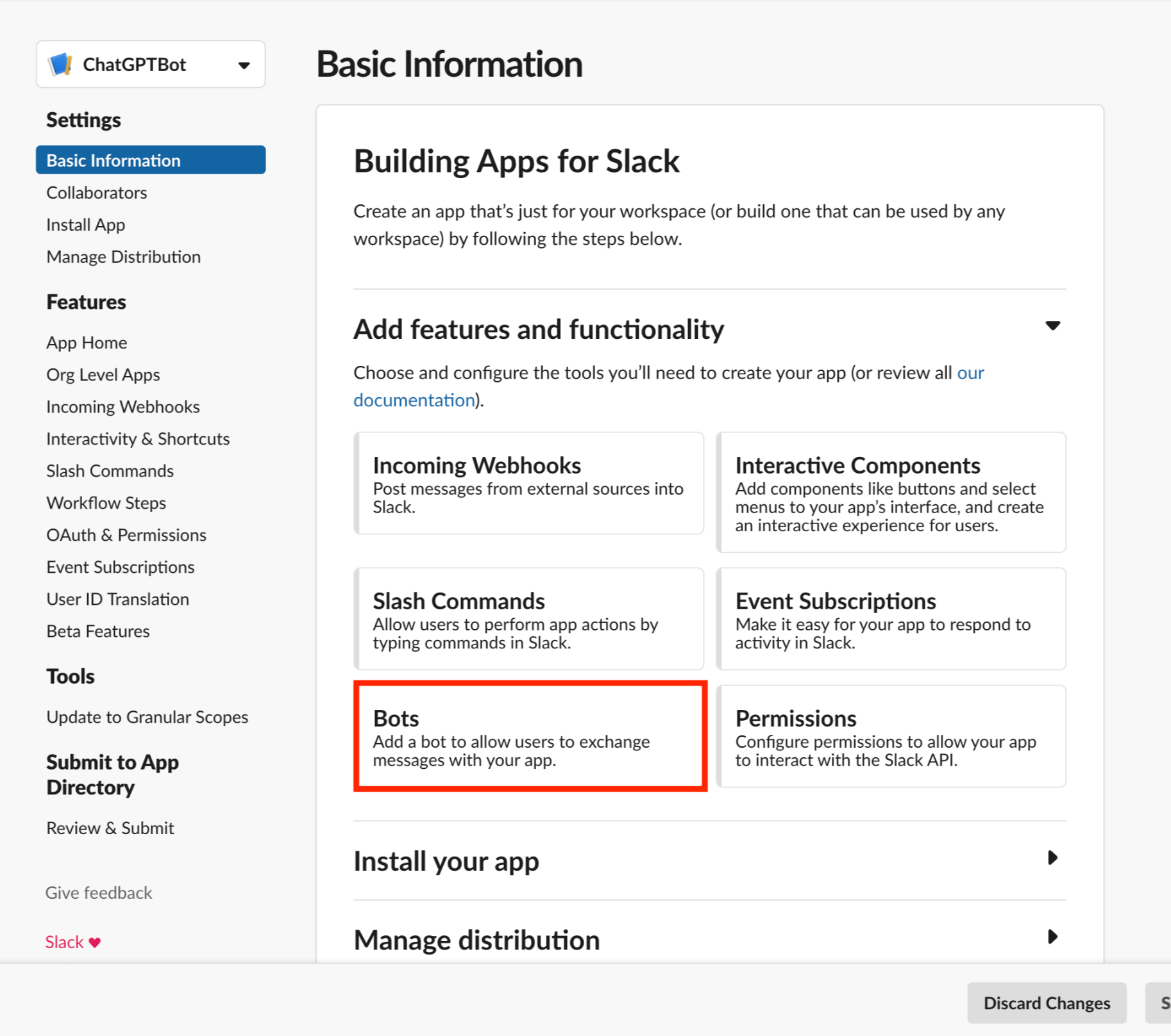 Bots 버튼을 눌러 생성한 ChatGPTBot 앱에 Bot을 추가해줄 것 이다.