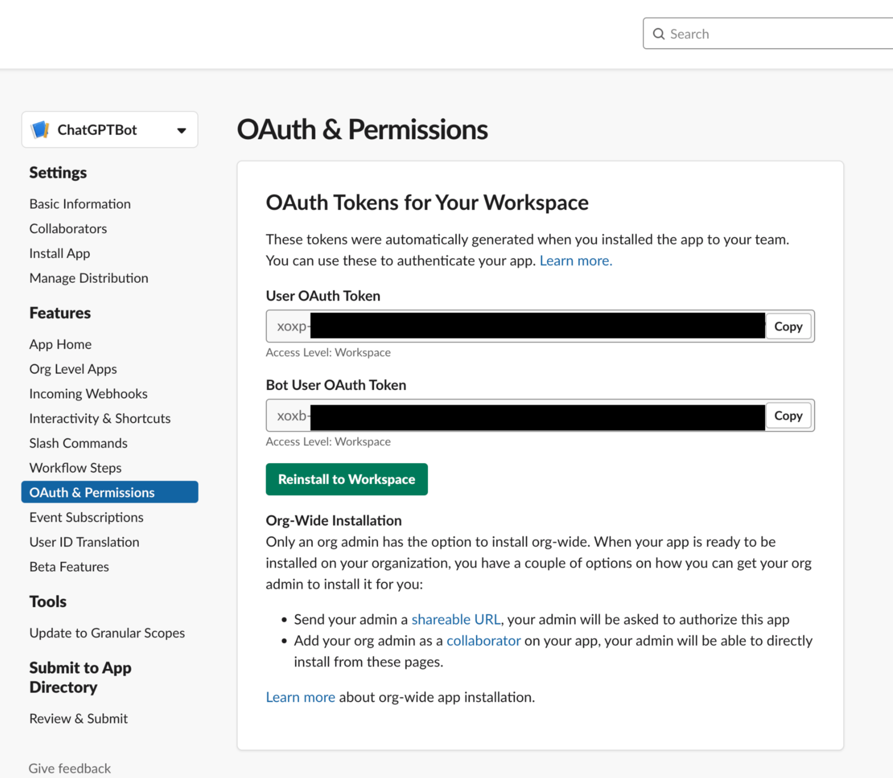 여기서 Bot User OAuth Token은 추후 코드에서 사용하게 되니, 따로 저장해둔다.