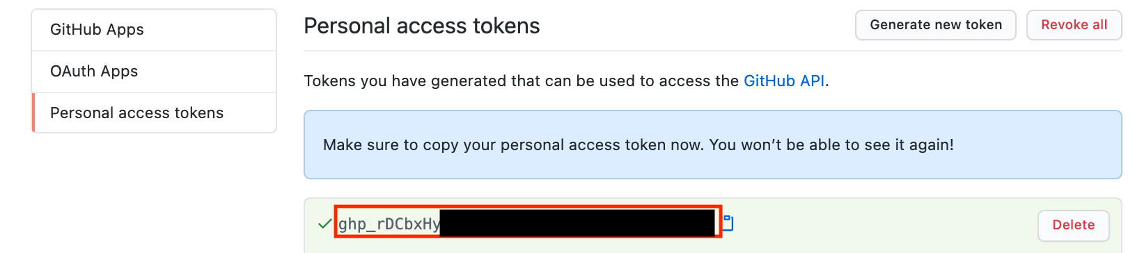 생성한 토큰값은 지금 시점에서만 볼 수 있어 꼭 메모장 같은 곳에 기록해두시길 바랍니다. 만약 토큰값을 잊어버렸다면 다시 생성 해야 합니다.