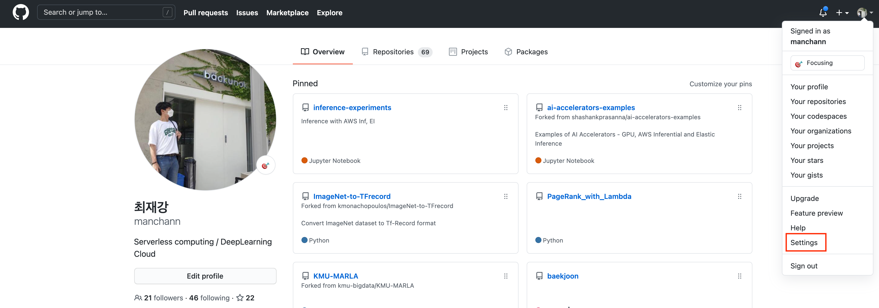 1. github 접속, 로그인 후 프로필을 클릭 → Setting 클릭